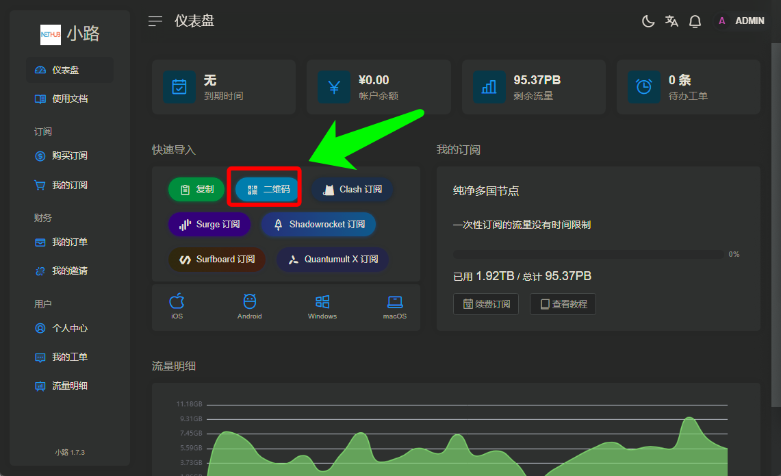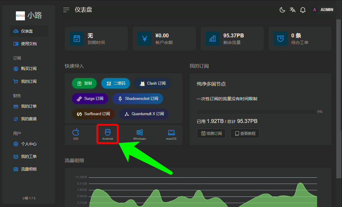 一、使用自己的邮箱和密码登录节点网站后,按照图示点击并下载安卓手机端V2rayNG的APP