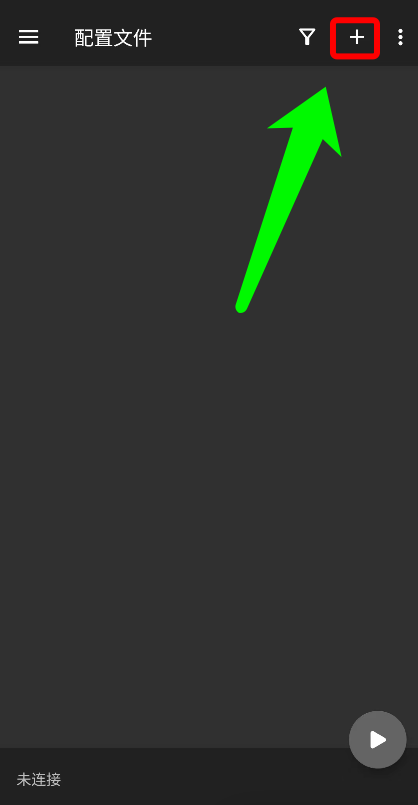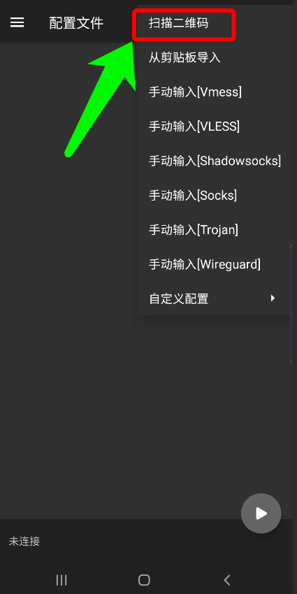 二、安装后,打开V2rayNG的APP,按照下图点击右上方的“+”号,随后再点击“扫描二维码”